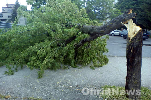 Невремето проследено со обилни врнежи од дожд и силен ветер, што деновиве го зафати Охрид, оштети повеќе дрвја во градот, а предизвика и проблеми со излевање на шахтите од канализацијата кои не можат да ги примат огромните количини дождовна вода.