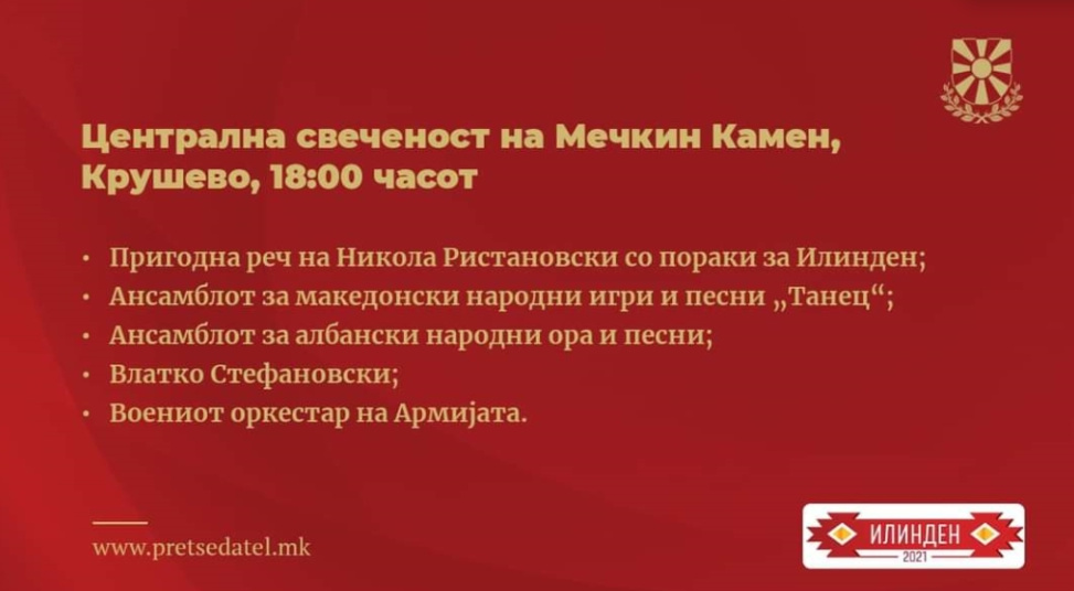 Во рамките на централната свеченост на Мечкин Камен во Крушево. како што објави претседателот Стево Пендаровски, пригодна реч ќе има актерот Никола Ристановски со пораки за Илинден. На свеченоста ќе настапат ансамблот за македонски народни игри и песни „Танец“, ансамблот за албански народни ора и песни, Влатко Стефановски и воениот оркестар на Армијата.