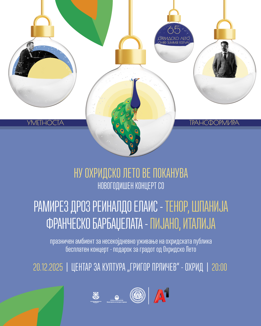 Оваа година ја заокружуваме со музика што возвишува. На нашата сцена ќе блеснат двајца исклучителни уметници: Франческо Барбаџелета – италијански пијано виртуоз со беспрекорна техника и емоционална длабочина што ја претвора секоја нота во чиста магија и Рамирез Дроз Реиналдо Елаис – шпански тенор со впечатлива моќ, топлина и драматичен израз што остава без здив, информираат од НУ „Охридско лето“.