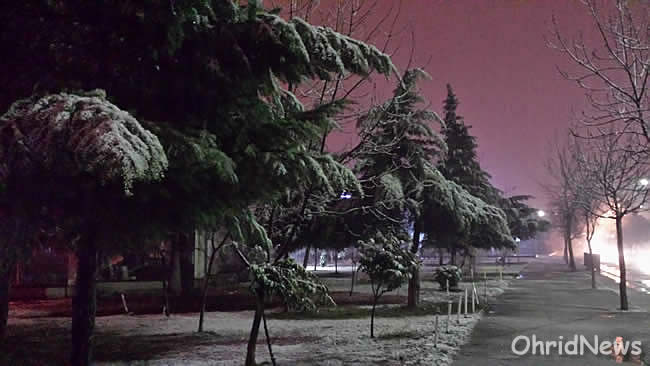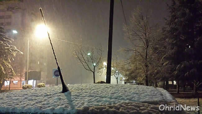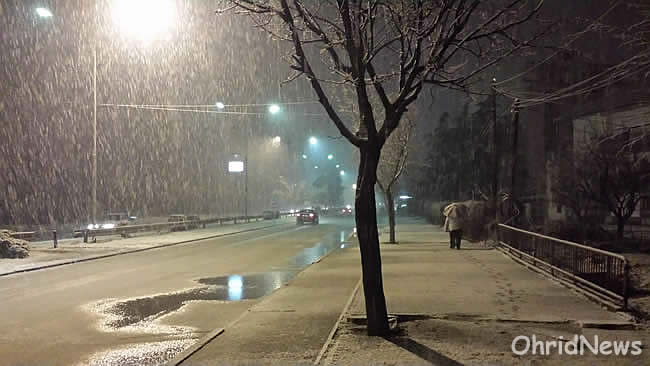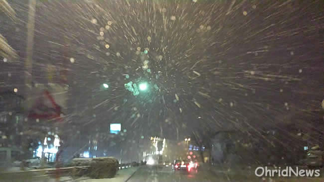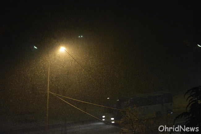 Циклонот „Давид“ попладнево донесе врнежи од снег во Охридско, кои вечерва се интензивираа.