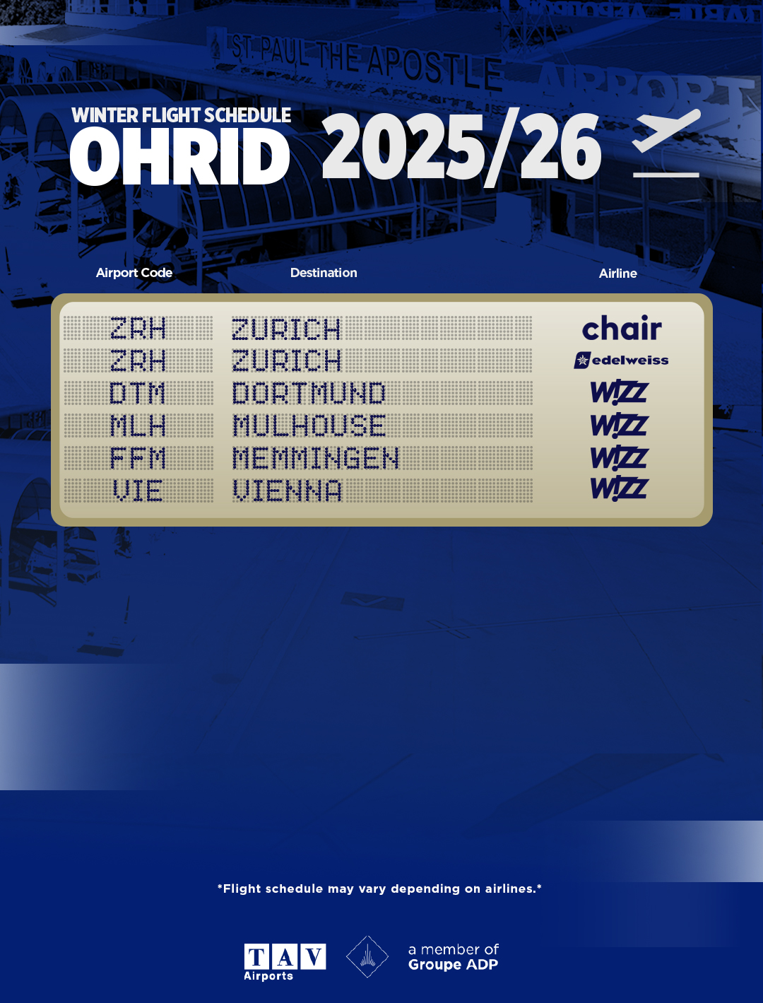 Од недела, 26-ти октомври 2025, почнува зимскиот распоред на летање на Аеродромот Св. Апостол Павле Охрид и ќе трае до 27-ми март 2026.