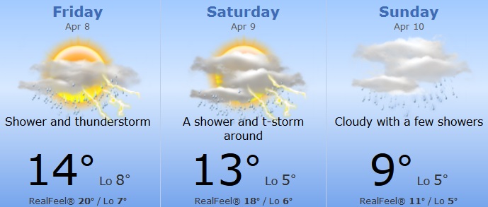 Според прогнозите од петок до недела ќе преовладува променливо облачно и посвежо време со повремени локални врнежи од дожд, а ќе има и услови за појава на грмежи особено во сабота.