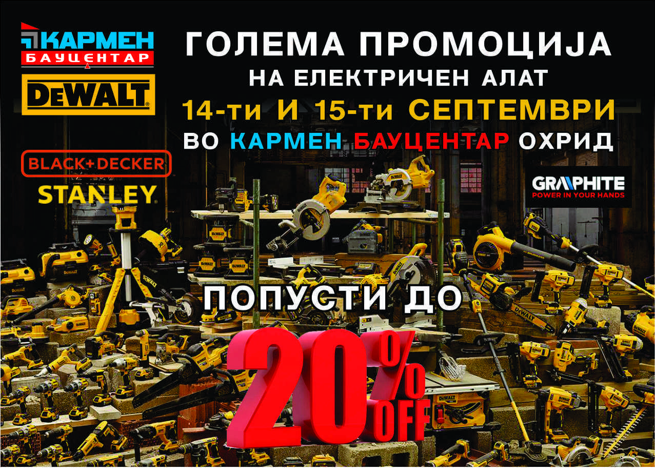 Овој петок и сабота, 14 и 15 септември, во салонот на „Кармен Бауцентар“ на улица „Железничка“ во Охрид, голема промоција и попусти на светски познатите брендови за електричен алат DeWALT, Black+Decker, Stanley, Graphite, Verto…