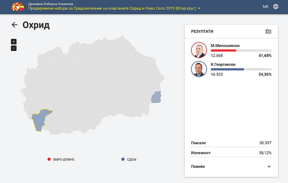 Двојните избори во Охрид донесоа спротивни резултати. Изборната трка за градоначалник ја доби кандидатот на СДСМ д-р Константин Георгиески, додека во локални рамки на изборите за претседател на државата во Охрид победи кандидатот на ВМРО ДПМНЕ, професорката Гордана Силјановска Давкова.
