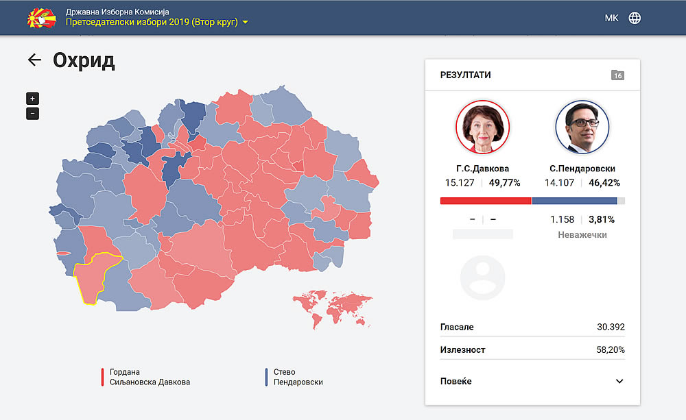 На изборите за претседател на државата во Охрид кандидатот на ВМРО ДПМНЕ Гордана Силјановска Давкова освои 15.127 гласа, а кандидатот на СДСМ Стево Пендаровски 14.107.
