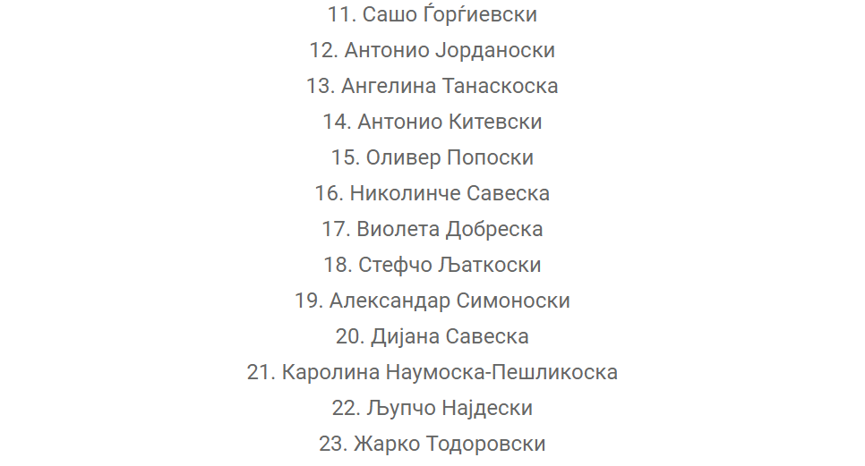 По него следат: Асен Савев, Мевља Шазиман, Александра Ставреска, Беркхан Махмуд, Берат Беќири, Симона Алексовска, Душан Велјаноски, Христина Шеќероска, Марија Филческа Мишевска, Сашо Ѓорѓиевски, Антонио Јорданоски, Ангелина Танаскоска, Антонио Китевски, Оливер Попоски, Николинче Савеска, Виолета Добреска, Стефчо Љаткоски, Александар Симоноски, Дијана Савеска, Каролина Наумоска- Пешликоска, Љупчо Најдески, Жарко Тодоровски.