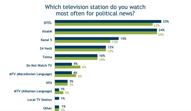 Што се однесува до медиумите, најновото истражување покажува дека најмногу граѓаните се информираат за политичките збиднувања од интернет и телевизиите, додека и натаму опаѓа довербата во радијата и печатените медиуми како извори на информации. Од телевизиите исклучително ниска доверба има националниот сервис, а речиси сите комерцијални тв станици, освен Алфа имаат значително поголема гледаност и доверба од МРТВ.