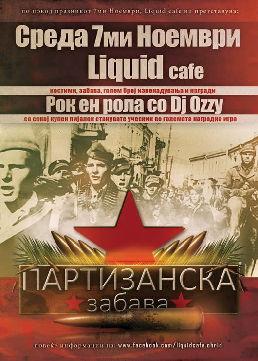 Кон одбележувањето на Денот на ослободувањето на Охрид, 7-ми Ноември, на инвентивен начин се приклучија и дел од охридските угостители. Кафе барот „Ликвид“ вечерва организира „Партизанска забава“, која според најавите ќе биде во духот на Денот на ослободувањето. Персоналот ќе биде облечен во партизански униформи, а за посетителите се предвидени интересни награди и изненадувања.