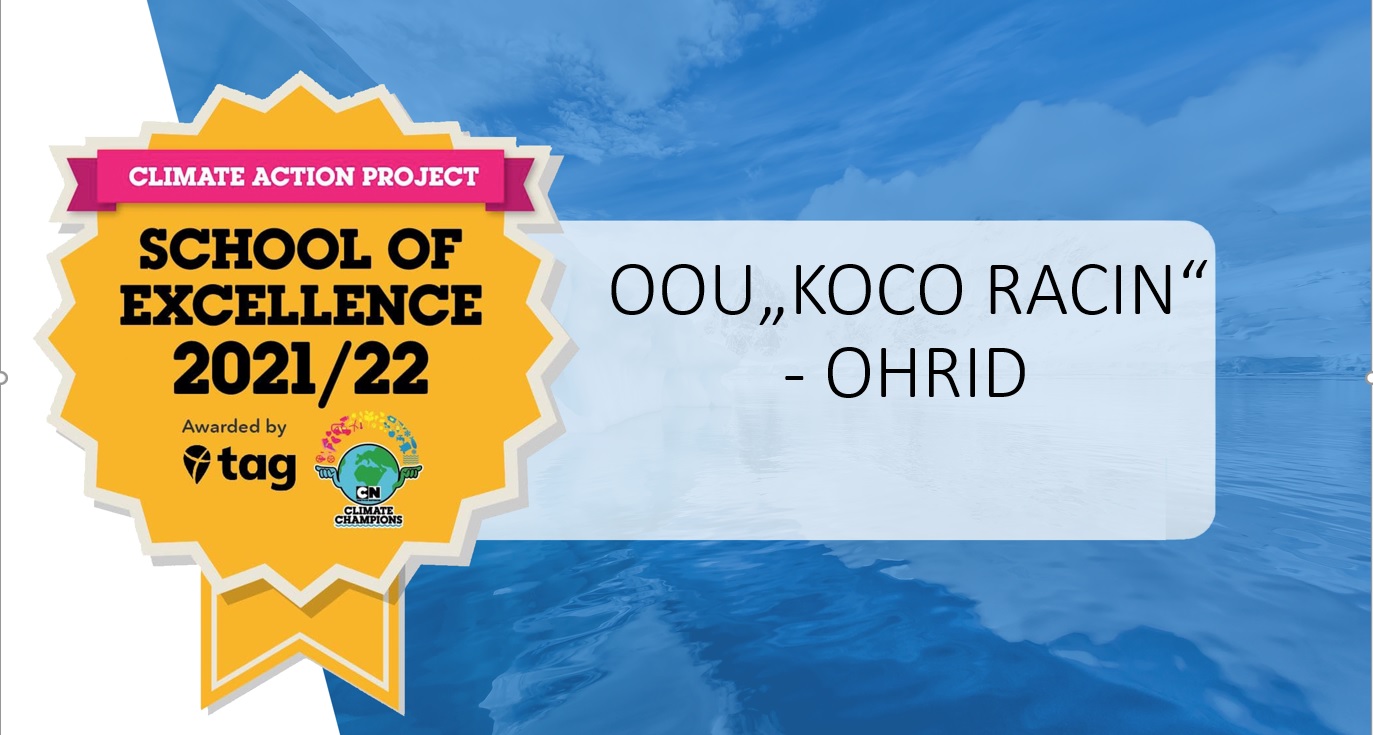 ООУ „Кочо Рацин“ ја освои оваа награда за проектот „Climate Action Project“ во трка со над 130.000 училишта ширум светот од 146 различни земји. На проектот во текот на 6 недели работеа 8 наставници и вкупно 110 ученици од 7 одделенија од училиштето. Учениците беа под менторство на наставничките Виолета Петковска, Наташа Неданоска, Силвана Крстеска, Татјана Лошкоска, Габриела Неделкоска, Јованка Анѓелкоска, Билјана Марковиќ Митков и Билјана Каланоска.