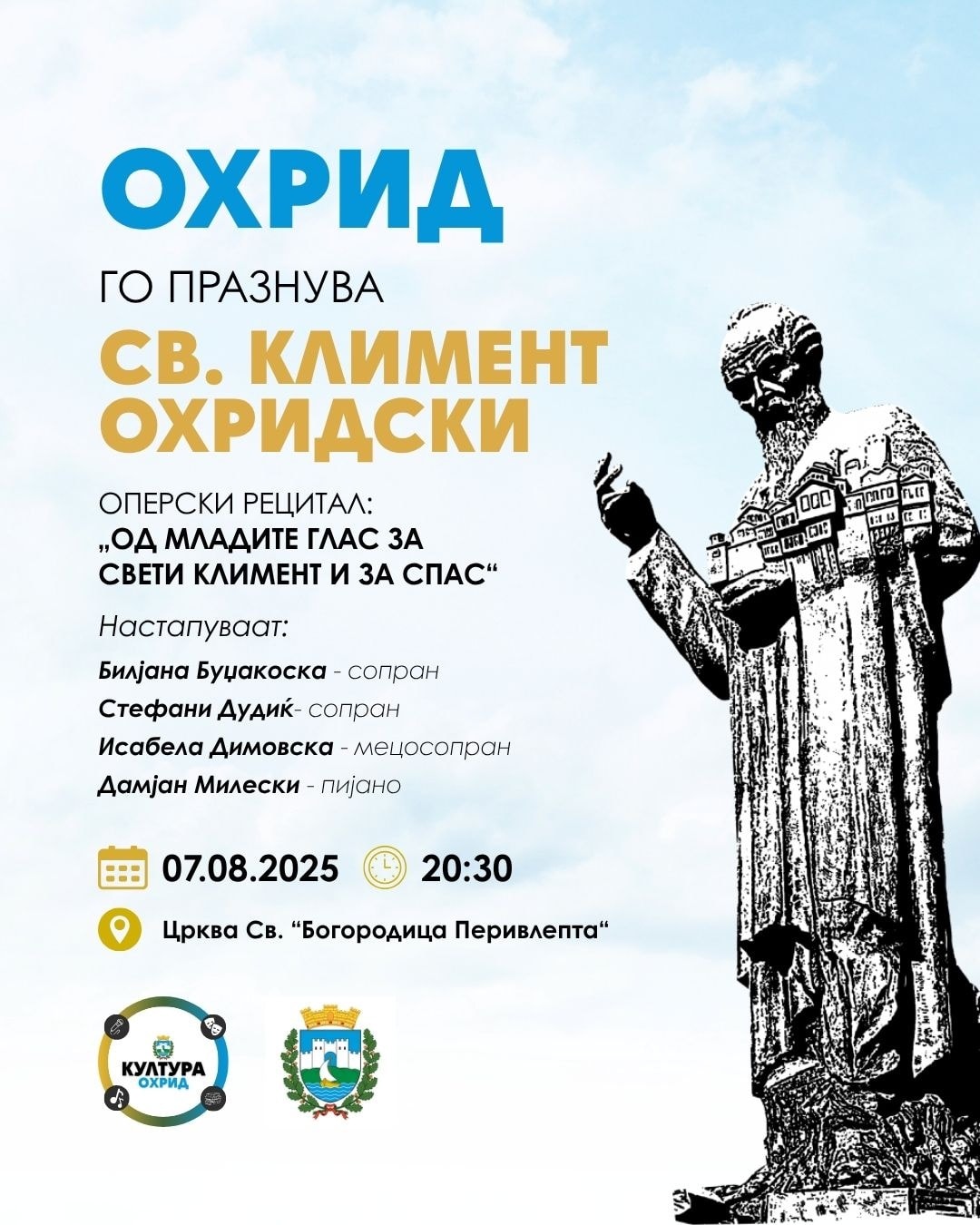 Во очи празникот на заштитникот на градот Св. Климент Охридски, ќе се одржи оперски рецитал „Од младите глас за Свети Климент и за спас”, на кој ќе настапат младите охридски музичари: Билјана Буџакоска- сопран, Стефани Дудуќ -сопран, Исабела Димовска -мецосопран, Дамјан Милески- пијано.