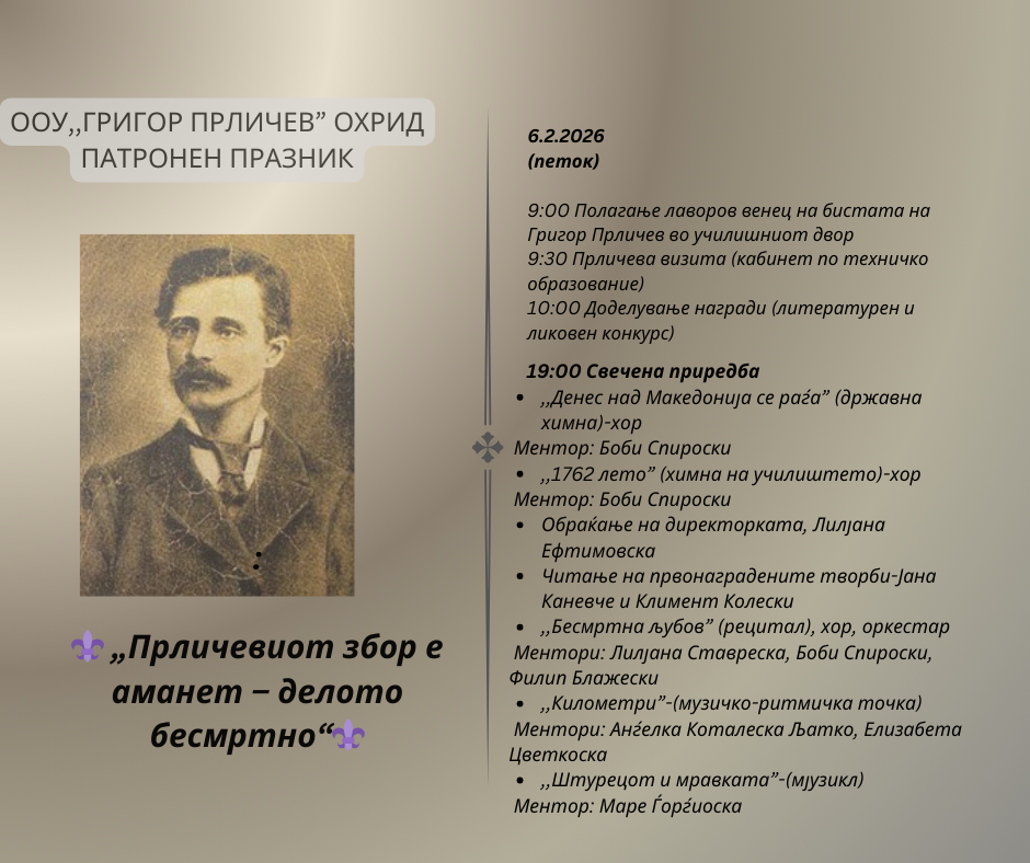 Под мотото „Прличевиот збор е аманет – делото бесмртно” ОУ „Григор Прличев“ во петок, 6-ти февруари, ќе го одбележи патрониот празник.