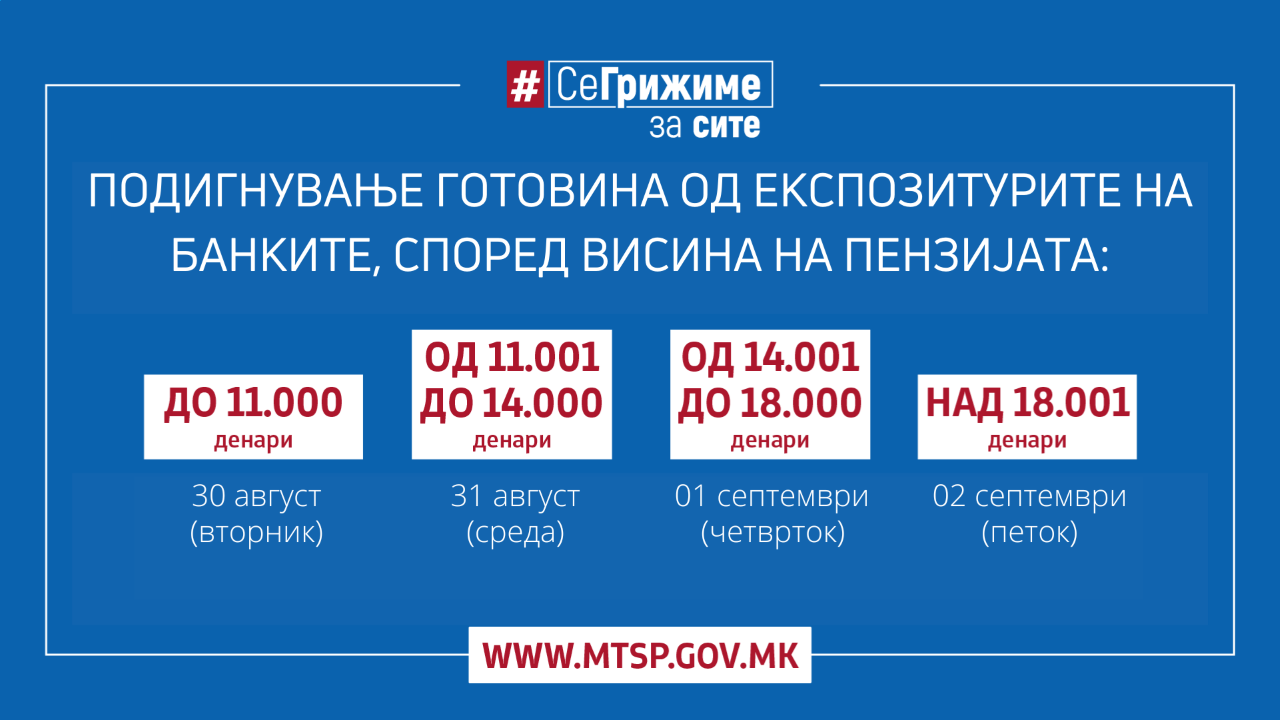 Денеска може да подигнат корисниците на пензии до 11.000 денари, утре ќе се исплаќаат пензиите во износ од 11.001 до 14.000 денари. Исплатата на пензиите од 14.001 до 18.000 денари ќе биде на 1 септември, а наредниот ден – пензиите повисоки од 18.001 денари.