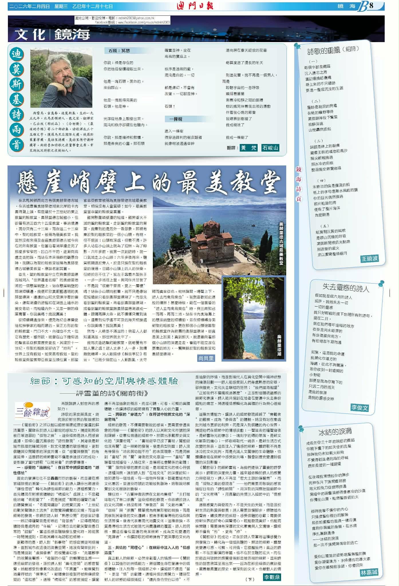 Во тиражниот кинески весник Macao Daily News (Макао Дејли Њуз), во додатокот за литература и култура „Огледално море“ (Mirror Sea / 鏡海) на една страница се објавени песни од македонскиот поет Славе Ѓорѓо Димоски, придружени со биографски податоци и со есеј под наслов „Тежината на поезијата“, кој всушност претставува коментар кон објавените песни на Ѓорѓо. Се наведува дека објавувањето во овој додаток се смета за голем успех и знак за висока културна вредност во кинеското говорно подрачје.