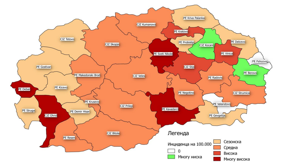 Сепак во четири ЦЈЗ/ПЕ (Дебар, Охрид, Свети Николе и Кавадарци) се бележи многу висока активност, во три (Кратово, Штип и Виница) – висока активност, средна активност се регистрира во единаесет ЦЈЗ/ПЕ, во девет се бележи сезонска активност, додека во две единици се бележи многу ниска активност на вирусот на грип, велат од ИЈЗ.