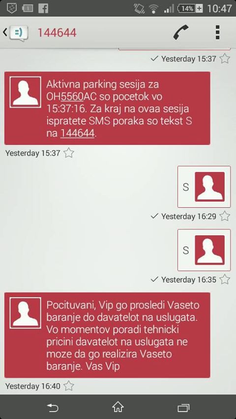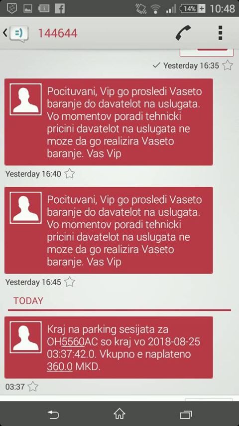 -Уредно пријавив почеток на паркирање со SMS порака, но при заминување системот со кој се регулира зонското паркирање во градот постојано покажуваше грешка. Се обратив до контролорите од кои добив образложение дека системот е паднат и толку. Потоа си заминав и доцна во ноќта ми стигнува порака дека дебело е наплатено.- вели Илија.
