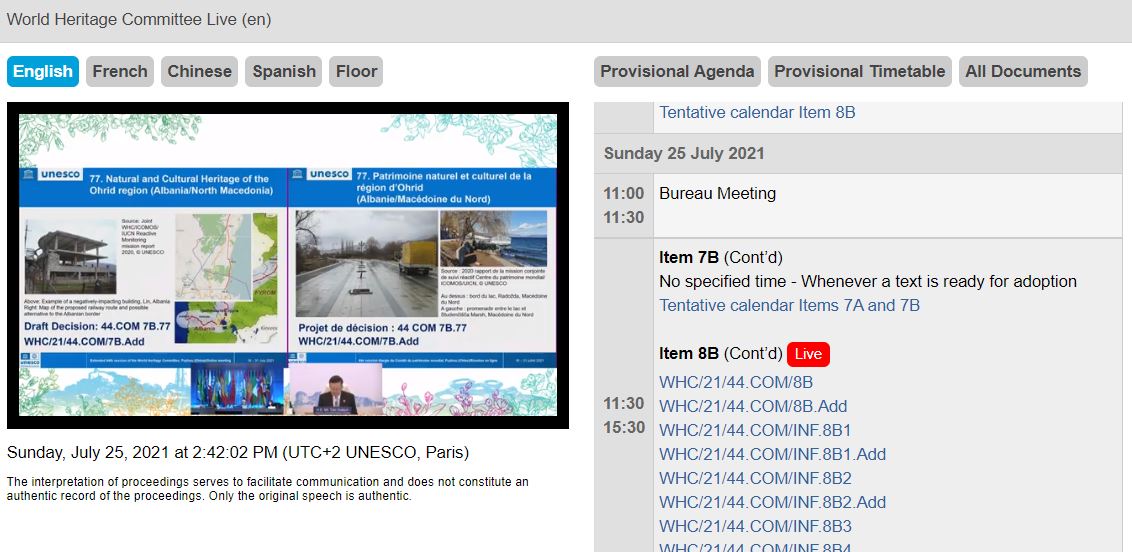 Комитетот за заштита на светското наследство на УНЕСКО на 44 сесија што се одржува во кинескиот град Фуџоу, вчера, усвои одлуката за состојбата на заштитеното културно и природно наследство на Охридскиот регион, со која Охридскиот регион останува и натаму на Листата на заштитени подрачја. На предлгог на Босна и Херцеговина, на Македонија и Албанија им се дава дополнителен рок за имплементација на препораките на Реактивната мисија на УНЕСКО од 2020 година и решавање на проблемите кои ги загрозуваат уникатните вредности на Охридскиот регион.