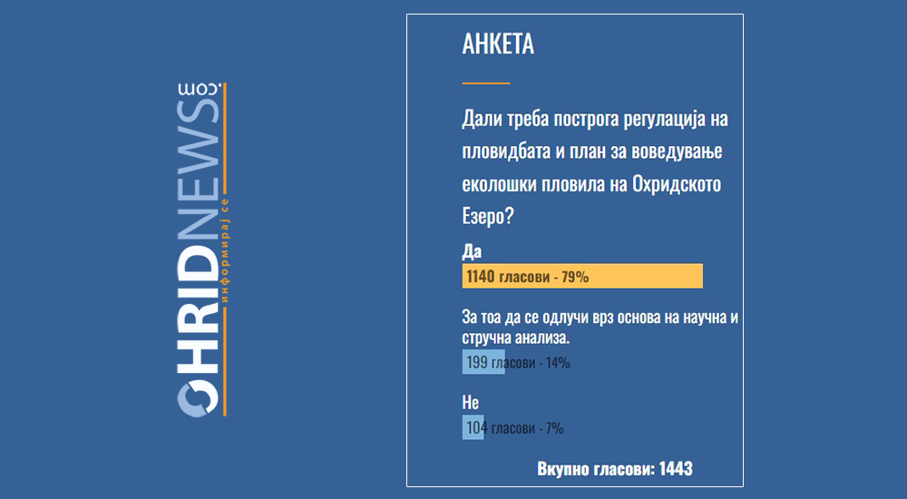 На прашањето: „Дали треба построга регулација на пловидбата и план за воведување еколошки пловила на Охридско Езеро?“ од вкупно 1443 учесници, 1140 одговориле позитивно, односно 79% од анкетираните, 199 (14%) сметаат дека за тоа треба да се одлучи врз основа на научна и стручна анализа, додека 104 (7%) се изјасниле негативно.