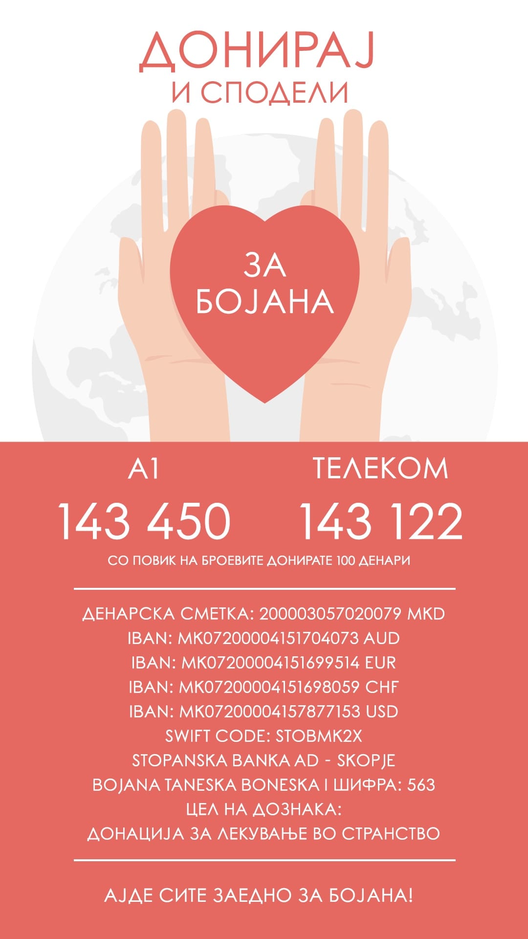 Хуманите граѓани може да донираат средства и на жиро сметката отворена за оваа намена, како и специјалните телефонски броеви преку мобилните оператори.