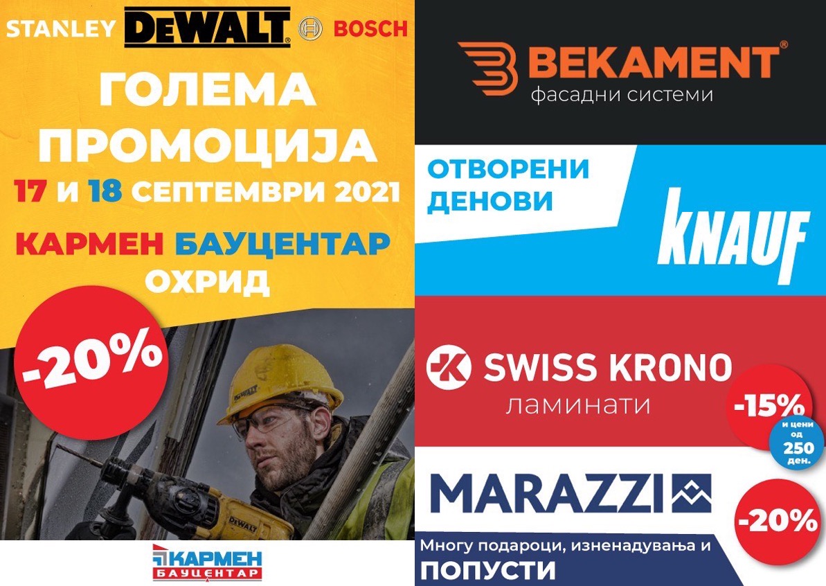 Оваа година на нашите купувачи ќе им бидат презентирани најновите технолошки достигнувања од областа на електричниот алат од брендовите “DeWALT”, “STANLEY” и “BOSCH” проследени со попусти од 20%. Воедно, сите ќе имаат можност да го тестираат посакуваното парче алат. За секое купено парче алат ќе следуваат подароци, велат од Кармен Бауцентар – Охрид.