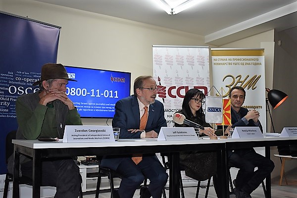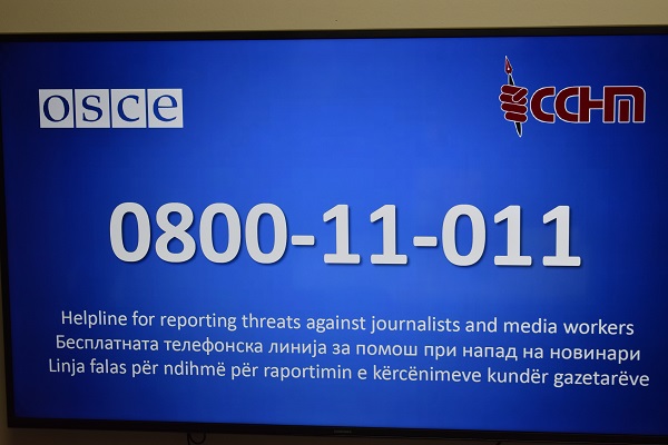 Мисијата на ОБСЕ во Скопје во партнерство со Самостојниот синдикат на новинари и медиумски работници (ССНМ) ја промовираше бесплатната телефонска линија 0800-11-011 за помош на новинари за известување во случај на закани, напади и насилство кон новинарите.