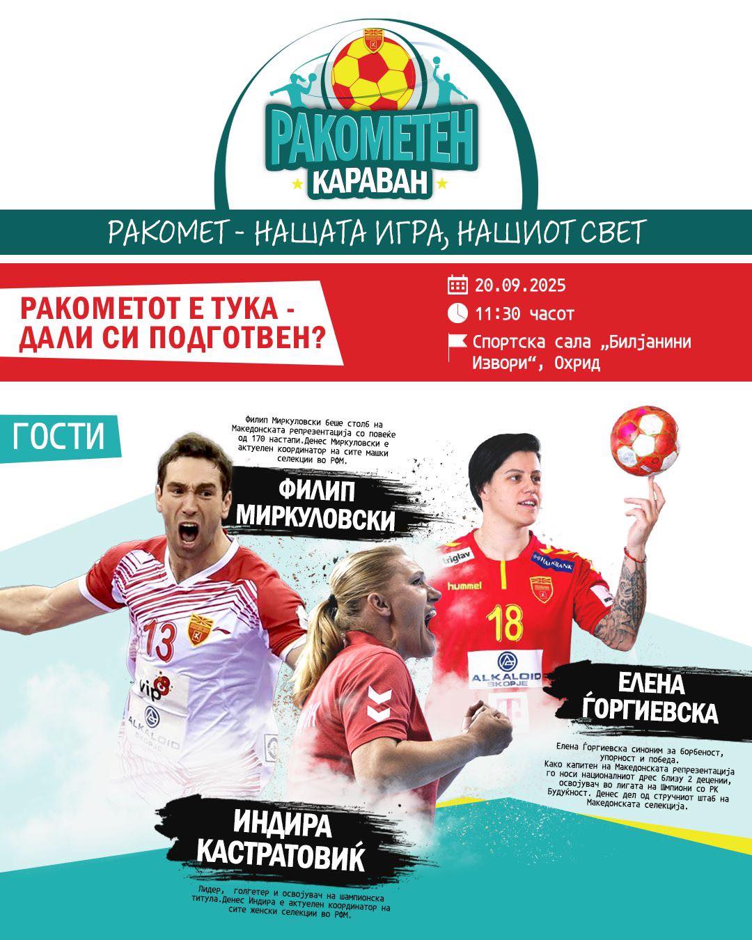 На 20 септември 2025 година, со почеток во 11:30 часот, во спортската сала „Билјанини Извори“ – Охрид, ќе се одржи настан под мотото: „Ракометот е тука – дали си подготвен?“.