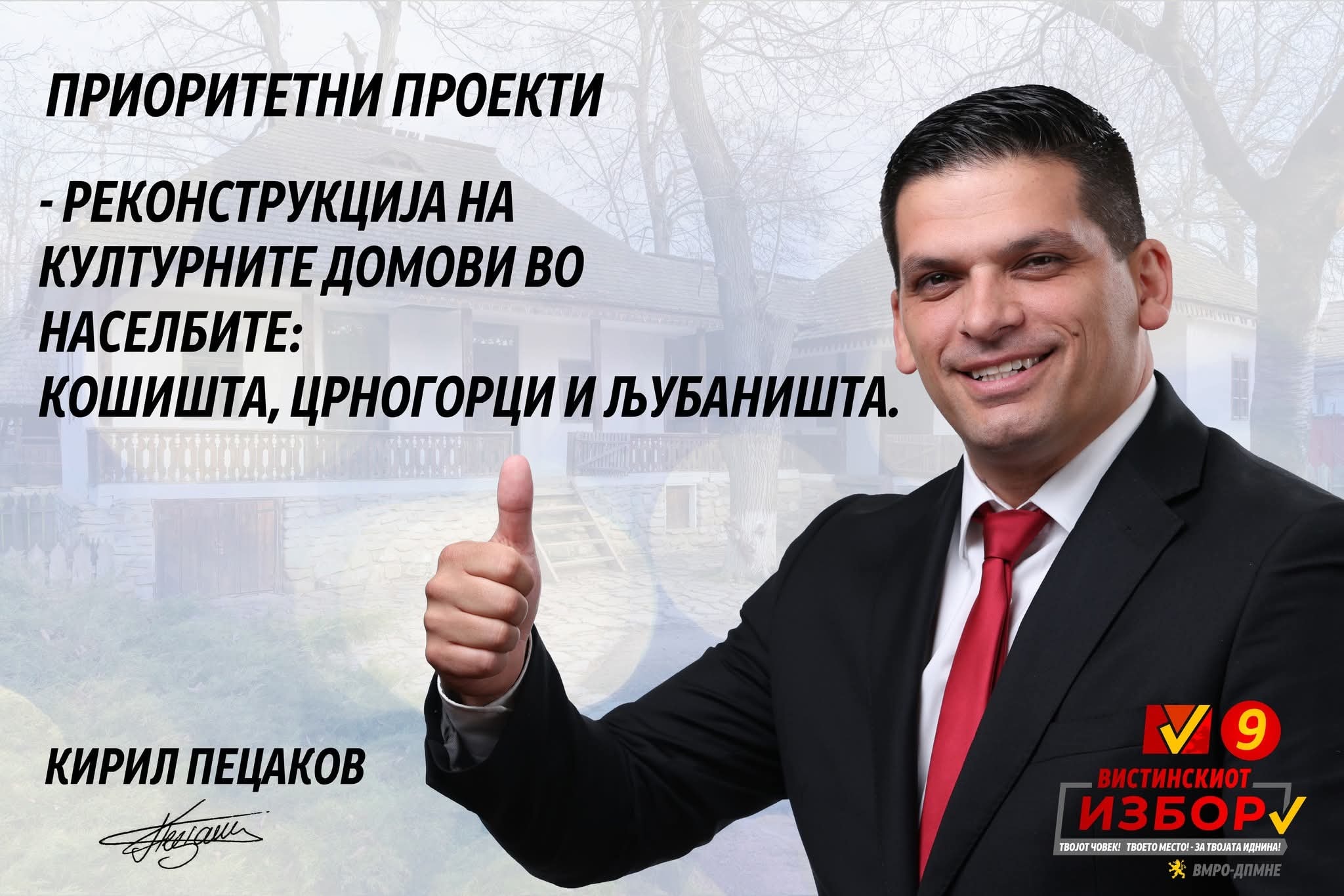Кандидатот за градоначалник на Охрид Кирил Пецаков поддржан од Коалицијата „Твоја Македонија“ предводена од ВМРО-ДПМНЕ како дел од приоритетните проекти во програмата за претстојните локални избори денес го најави четвртиот кој се однесува на реконструкција на домовите на култура во Љубаништа, Кошишта и Црногорци.