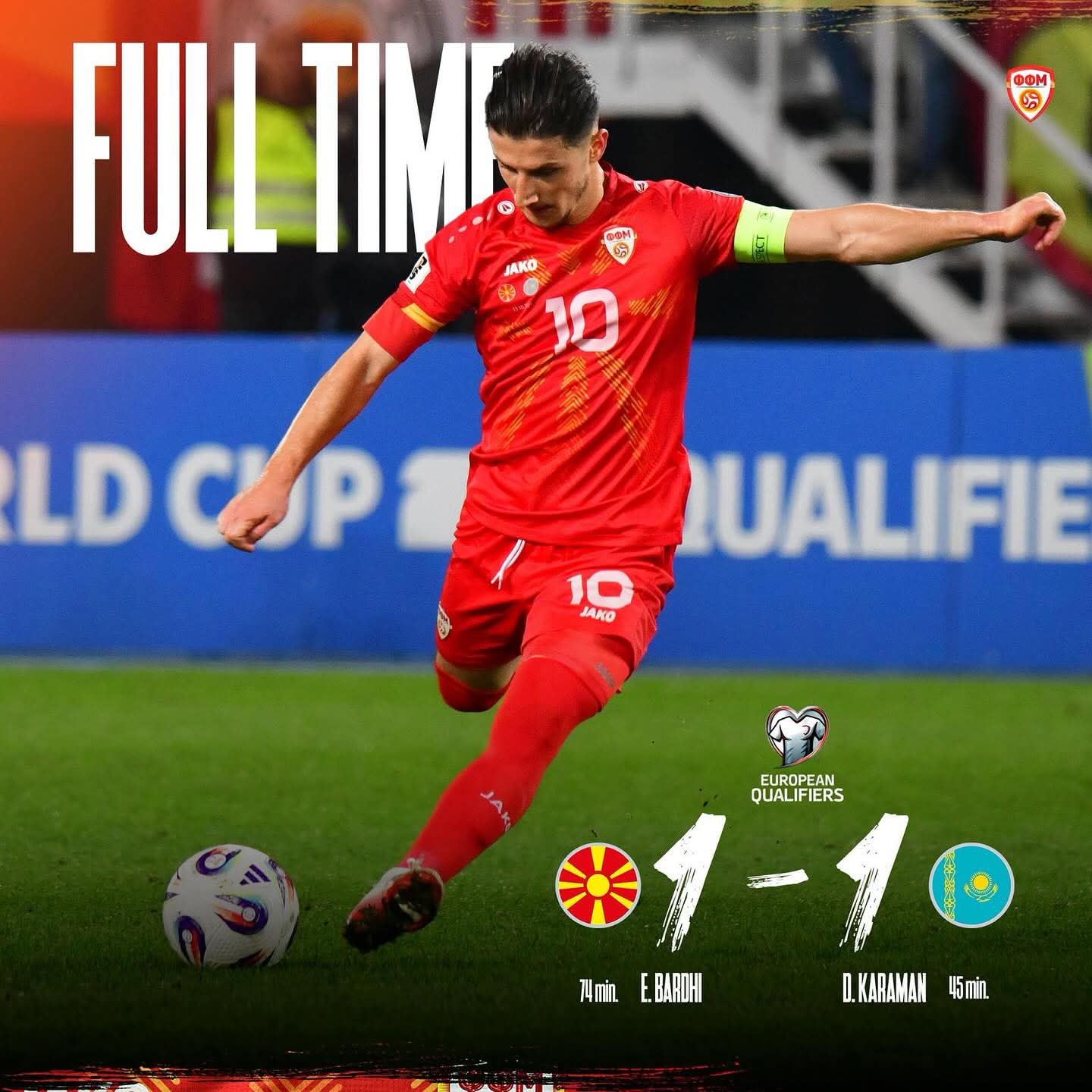 До крајот на мечот Македонија притискаше, но не успеа да го сврти резултатот. Најголемата прилика ја имавме во 95 минута но казахтанците успеаја да го одбијат последниот налет на црвено-жолтите.