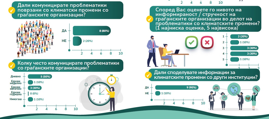 31 граѓанска организација учествувала на анкетата. Направена е анализа на нивните потреби и капацитети, за кои беа организирани осум обуки. Половина од анкетираните одговориле дека барем еднаш месечно комуницираат со своите целни групи за климатските промени. На прашањето дали добивате информации од климатските промени од институциите и општината, 58.1 отсто одговориле потврдно. 20 организации одговориле дека ги информираат институциите за прашања од оваа проблематика.