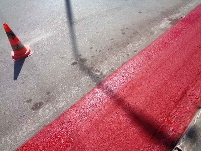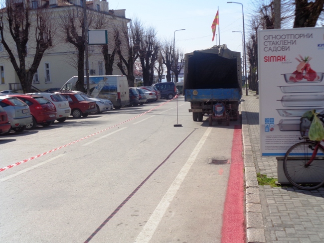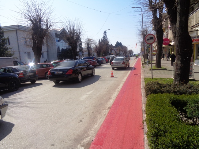 Со црвена боја денес на улицата „Македонски просветители“ се врши обележување на делот од улицата наменет за движење на велосипеди.