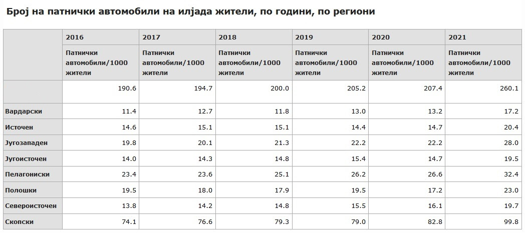Според податоците од Државниот завод за статистика во земјава има 260 патнички автомобили на илјада жители во 2021 година или околу четири луѓе на еден автомобил. По статистички региони најмногу има во Скопскиот 100 возила на 1 000 жители, а најмалку Вардарскиот регион само 17 возила на 1 000 жители. Втор по број на возила е Пелагонискиот регион со 32 автомобили на 1 000 жители.