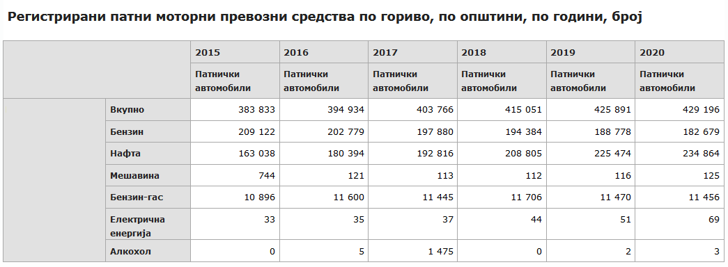 Интересно е дека пред само неколку години на патиштата низ државата доминирале бензински автомобили. Во 2015 година од 383 илјади возила над 54 проценти биле на бензин, а дизел – 42 проценти. Учеството на бензинските автомобили на патиштата е во постојан пад, па така во 2016 нивниот удел е 51 процент, во 2017 – 49 отсто, за во 2018 да падне на 46 проценти и за првпат на патиштата над половината од патничките возила да користат дизел како погонско гориво. Уделот на бензинските мотори продолжува да се намалува и во 2019 е 44 отсто, во 2020 година 42 проценти, за во 2021 да падне на 40 отсто.