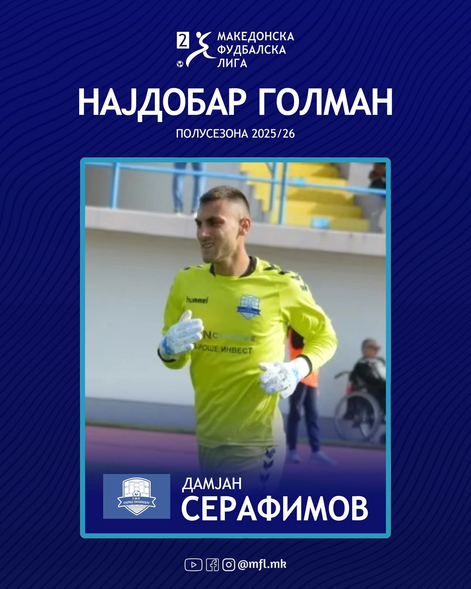 Дамјан Серафимов од ГФК Охрид е прогласен за „Најдобар голман“ на есенската полусезона во 2 македонска фудбалска лига според изборот на 2 МФЛ.
