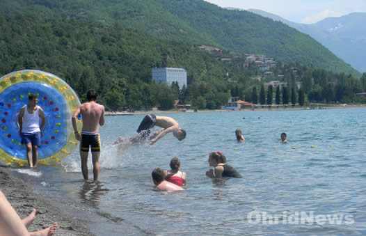 Жешкото сонце викендов ги наполни охридските плажи. Живата во термометрите деновиве се искачи над 30-от степен, а охриѓини и туристите уживаат разладувајќи се во езерските води.