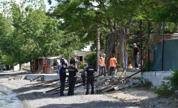 Извршители придружувани од надлежен инспектор и полициска асистенција, утрово ја продолжија акцијата за отстранување на урбана опрема, шанкови и објекти од плажите во Св. Стефан, што се спроведува по налог на Општина Охрид.