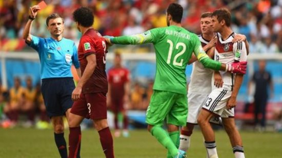 Пепе на дуелот Португалија – Германија прво имаше еден дуел со Томас Милер, а откако Германецот падна на теренот, Пепе му пријде и без топка со глава уште еднаш го удри. Помошниците а и српскиот арбитар Матиќ го забележа тоа и му додели директен црвен картон.