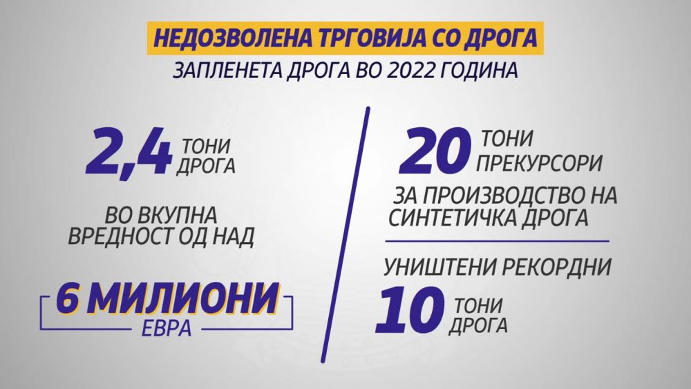 Воедно, во делот на недозволена трговија со дрога, информира Спасовски, во 2022 година е извршено најголемото уништување на запленета дрога досега, вкупно 10 тони дрога.