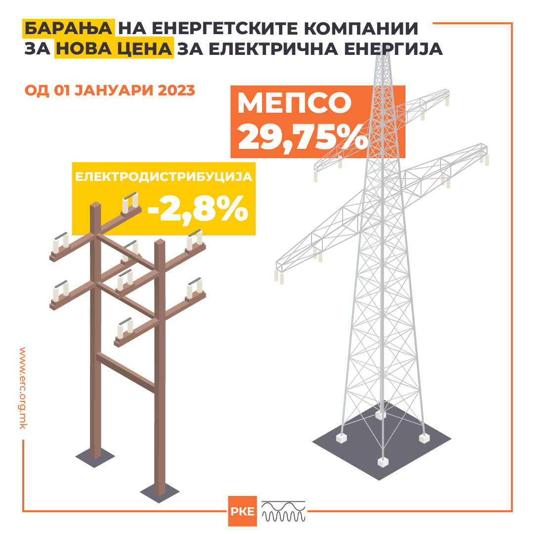 Трите енергетски компании ги доставија своите барања до Регулаторната комисија за енергетика и водни услуги (РКЕ) за цената на електричната енергија на регулираниот пазар по 1 јануари идната година. АД МЕПСО бара зголемување на цената за пренос на електрична енергија за 29,75 проценти, „ЕВН Електродистрибуција“ бара намалување на услугата за дистрибуција на електрична енергија за 2,8 проценти, а универзалниот снабдувач „ЕВН Хоум“ бара зголемување за пет отсто на цената за снабдување со електрична енергија.