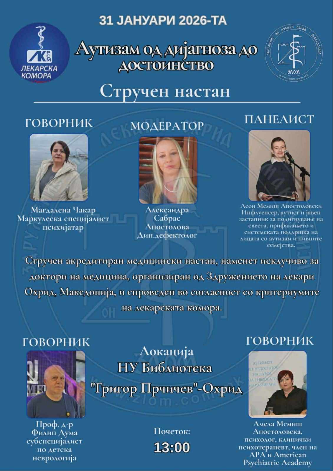 Стручен настан за доктори на медицина – 2026 „Аутизам од дијагноза до достоинство“ ќе се одржи утре во НУ Библиотека „Григор Прличев“ Охрид со почеток во 13 часот во организација на Здружението на лекари Охрид, со поддршка од фармацевтската компанија Фитофарм.