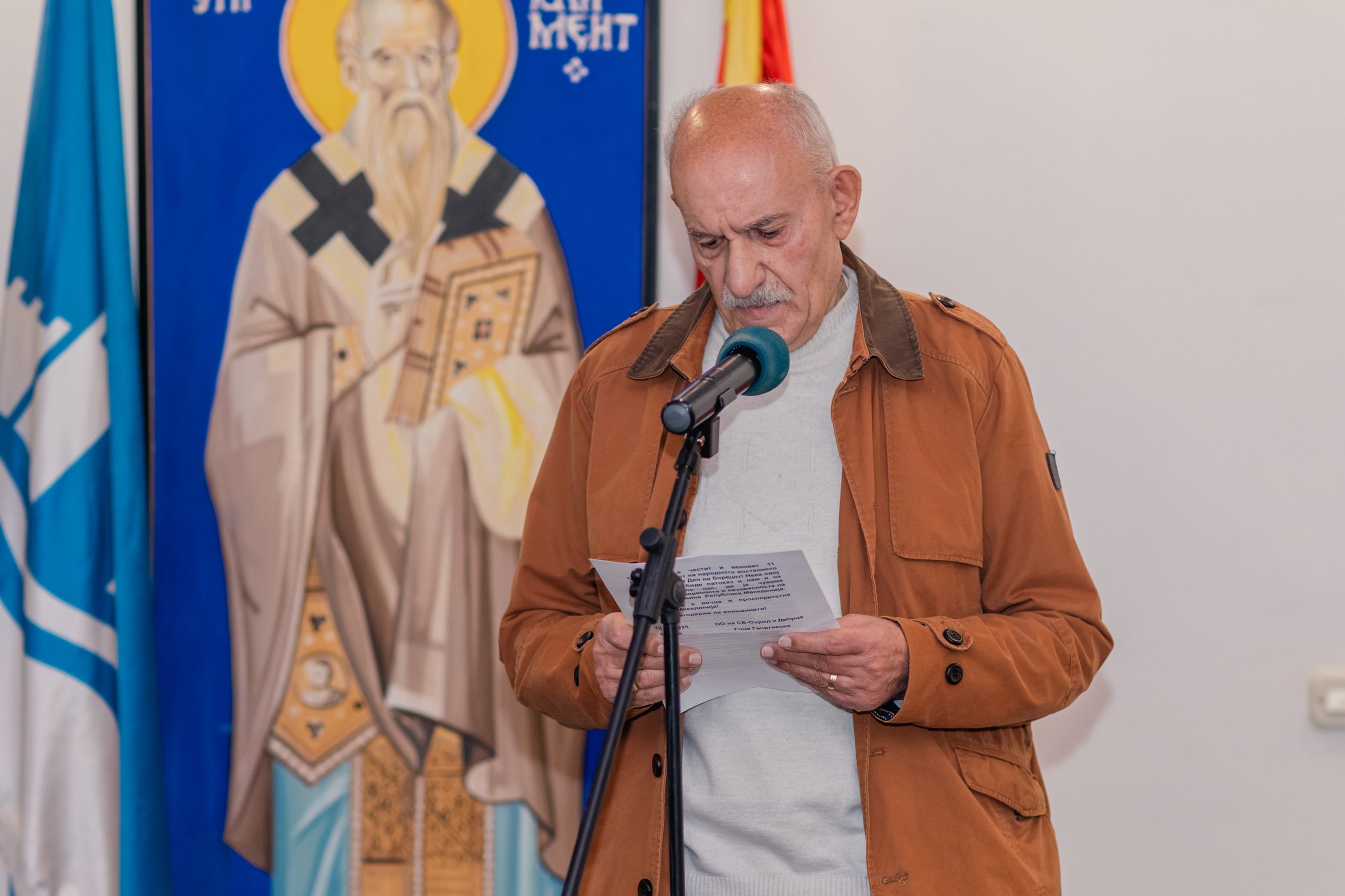 Пред присутните се обрати градоначалникот на Општина Охрид, Кирил Пецаков кој истакна дека Народноослободителната борба претставува симбол на непокорот, достоинството и вековната борба за мир и правдина, а преку пожртвуваноста на нашите херои се изгради темелот на македонската државност и идентитет.