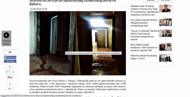 Тузлански „Инфопортал“ и хрватскиот „Данас“ пишуваат дека студентскиот „Гоце Делчев“ во Скопје претставува „најодвратен дом на Балканот“, без струја и топла вода, со пукнати цевки, нефункционалност, влага и дупки по подот.