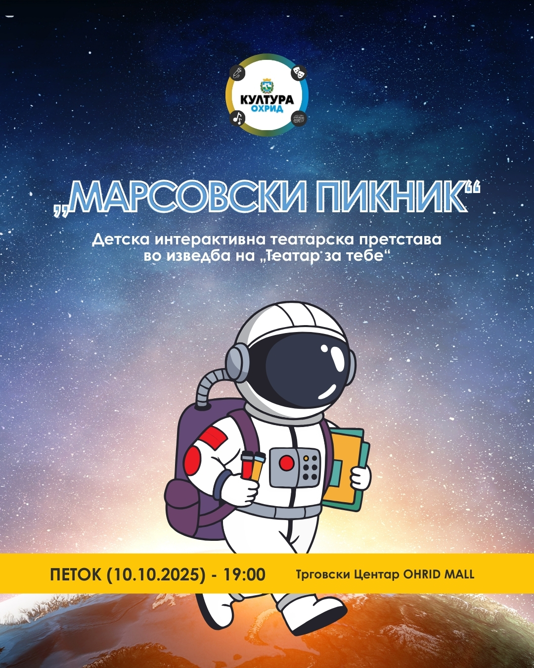 Денес ќе биде одиграна детската интерактивна театарска претстава „Марсовски пикник“ во изведба на „Театар за тебе“ во рамки на проектот на Општина Охрид „Културата расте со децата – За сите деца“.