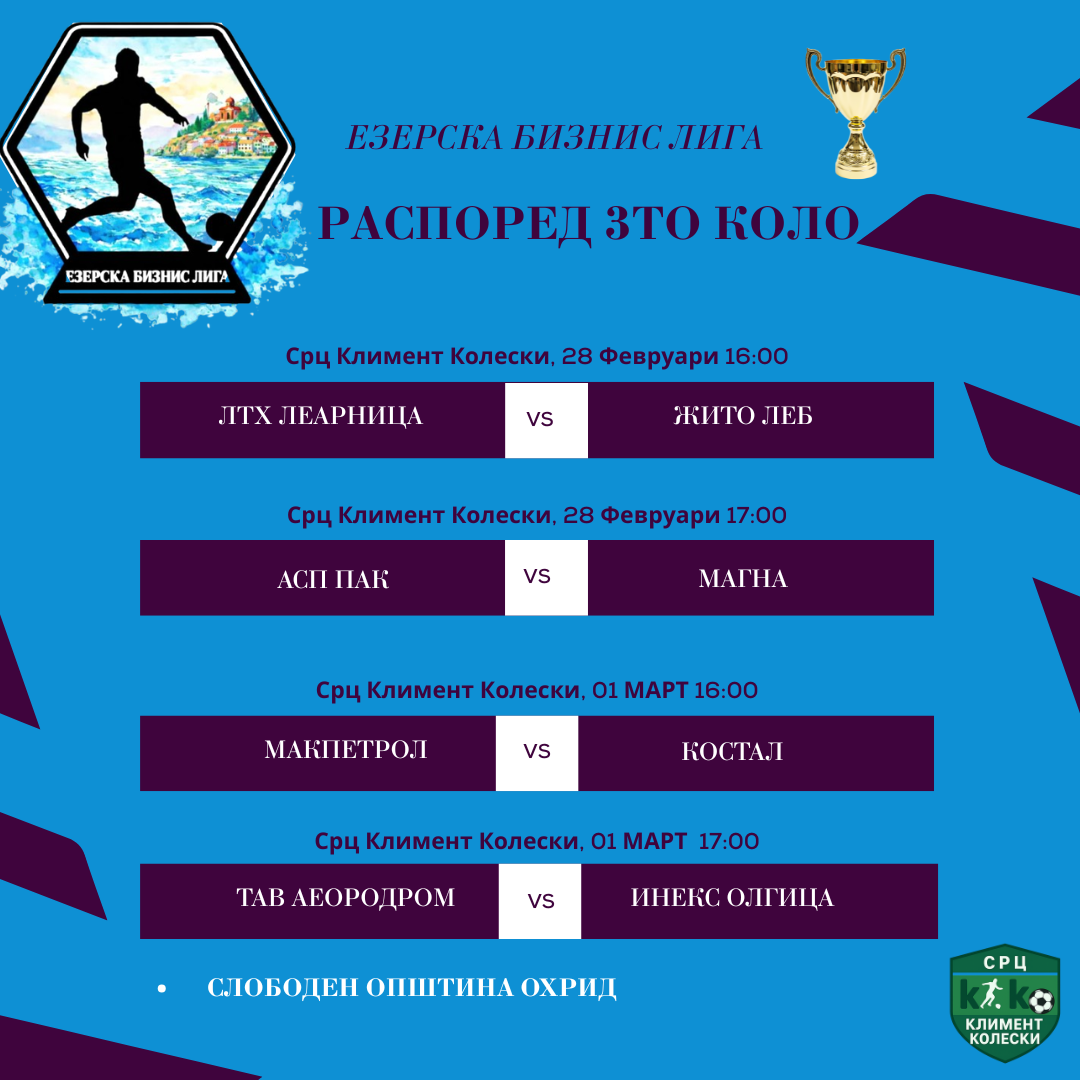 Третото коло од фудбалскиот турнир „Езерска бизнис лига“ ќе се одигра викндов на 28 февруари и 1 март во Спортскиот центар „Климент Колески“.