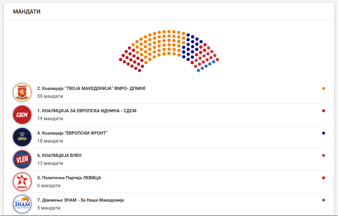 Опозициската ВМРО ДПМНЕ според првичните неофицијални резултати освои 59 пратенички мандати, остварувајќи убедлива победа на парламентарните избори одржани денеска. Најголемиот политички ривал и владејачка партија до сега, СДСМ, на изборите освои 18 мандати што е под најпесимистичките проекции, ДУИ има 19, а ВЛЕН 13, Левица 6, ЗНАМ 6…