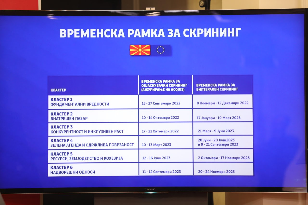 Тој потсети на порано презентираниот календар, кој е заеднички подготвен со Брисел, според кој скринингот ќе започне на 15 септември, а ќе трае до крајот на 2023 година. Во тек е интензивна комуникација со Брисел и се прават забрзани подготовки и во тренинг центарот на СЕП.