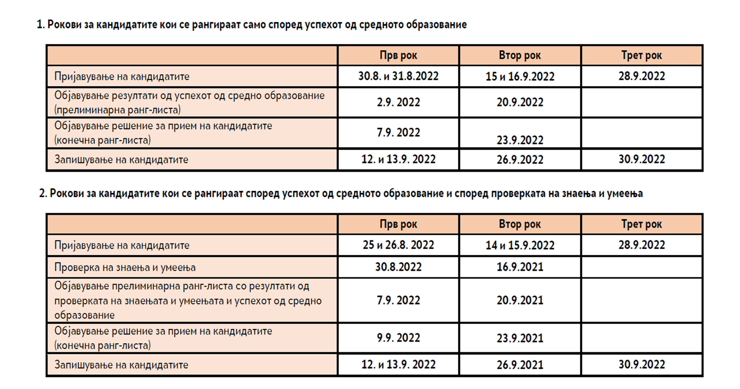 Оние кандидати кои покрај успехот од средното образование се рангираат и според проверка на знаења и умеења, првиот рок за пријавување е на 25 и 26 август во првиот рок, вториот е на 14 и 15 септември и третиот рок на 28 септември.