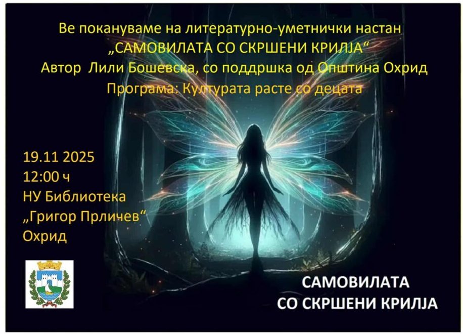 Утре – среда, НУ Библиотека „Григор Прличев“ од Охрид ќе биде домаќин на литературно – уметничкиот настан „Самовилата со скршени крилја“. Всушност ќе се случи промоција на истоимениот роман од познатата македонска писателка Лили Бошевска од Битола.