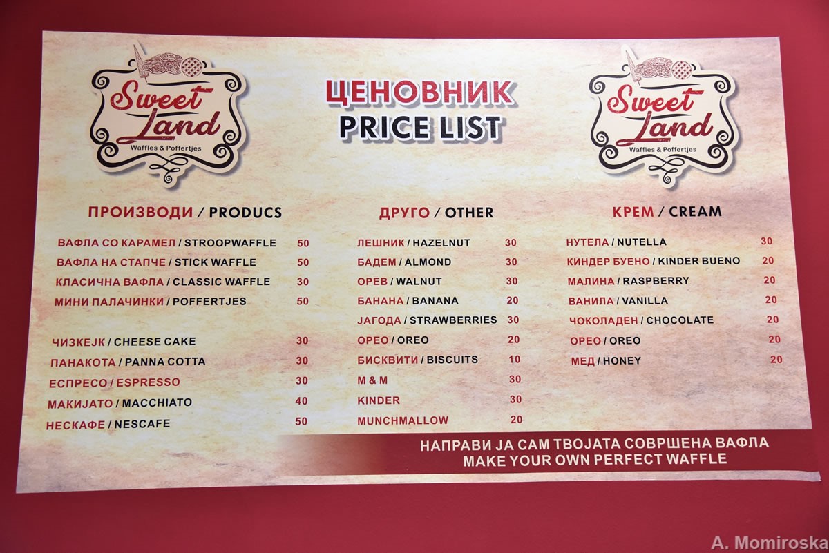 Работното време на специјализирана продавница за вафли и десерти „Sweet land“ е од 09-21 часот, од понеделник до сабота.