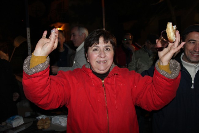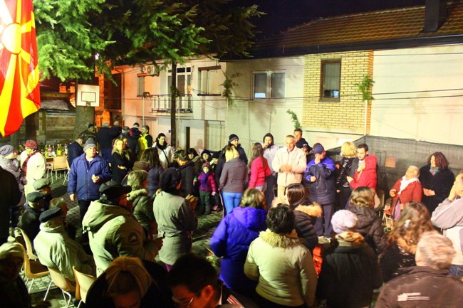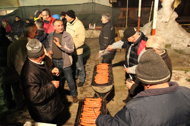 Веселата атмосфера беше надополнета со неколку маски, со печење колбаси на жар, топол леб, туршија и црвено домашно вино, а се печеа и компири во фолија. Точно на полноќ, минатогодишните кумови Сашо и Тања Мариноски на околу 70 тина луѓе им поделија банички со сирење. Среќата која ќе ја следи преку цела година и се насмевна на Снежана Змејкоска која ја пронајде паричката во својата баничка.