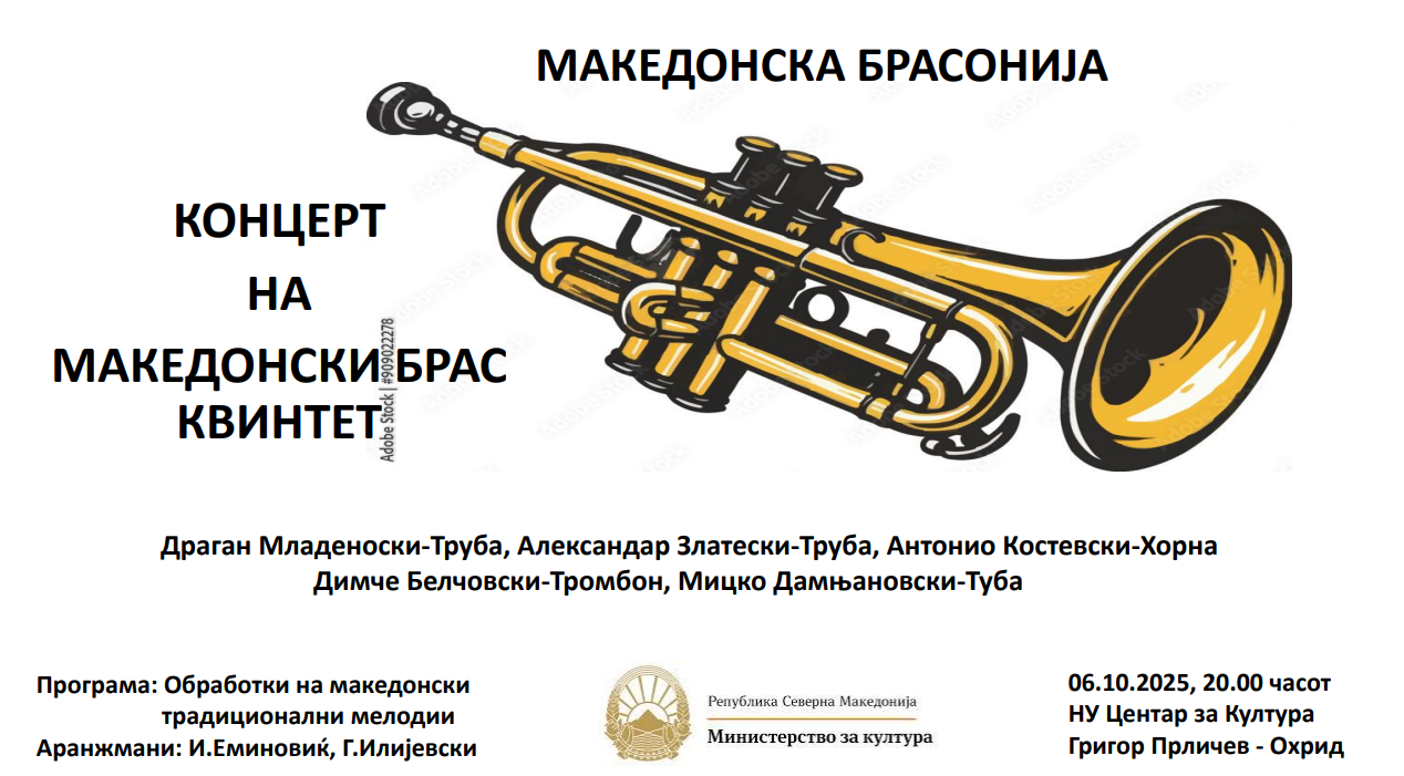Во Центарот за култура „Григор Прличев“ во Охрид вечерва со почеток од 20 часот концерт ќе одржи „Македонски Брас Квинтет“. На репертоарот ќе бидат обработки на македонски традиционални мелодии. Концертот е поддржан од Министерството за култура и туризам, а влезот е бесплатен.