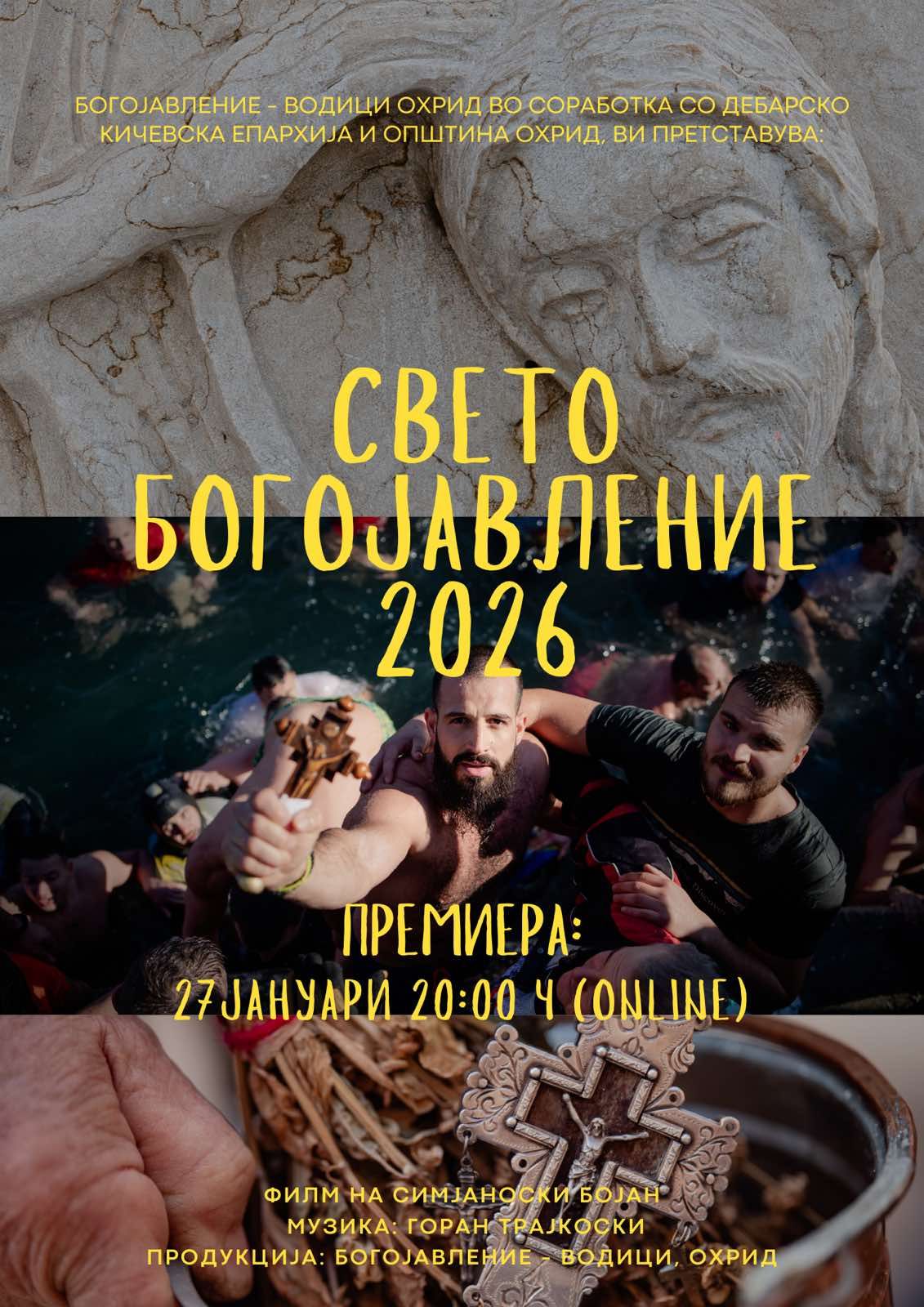 Филмот е дело на Бојан Симјаноски, со музика на Горан Трајкоски. Премиерата ќе биде вечерва, 27 јануари 2026 година, во 20:00 часот, на интернет платформите YouTube, Facebook и Instagram, преку профилите на Богојавление Водици.